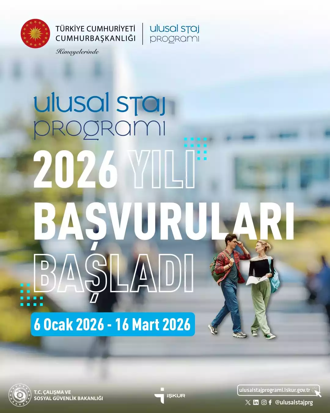 Cumhurbaşkanlığı himayelerinde Türkiye İş Kurumu koordinasyonunda gerçekleştirilen Ulusal Staj Programı (USP) 2026 yılı öğrenci başvuruları 6 Ocak 2025 tarihi itibarıyla başlamış olup 16 Mart 2026 tarihine kadar devam edecektir. İlgili öğrencilerimize duyurulur.