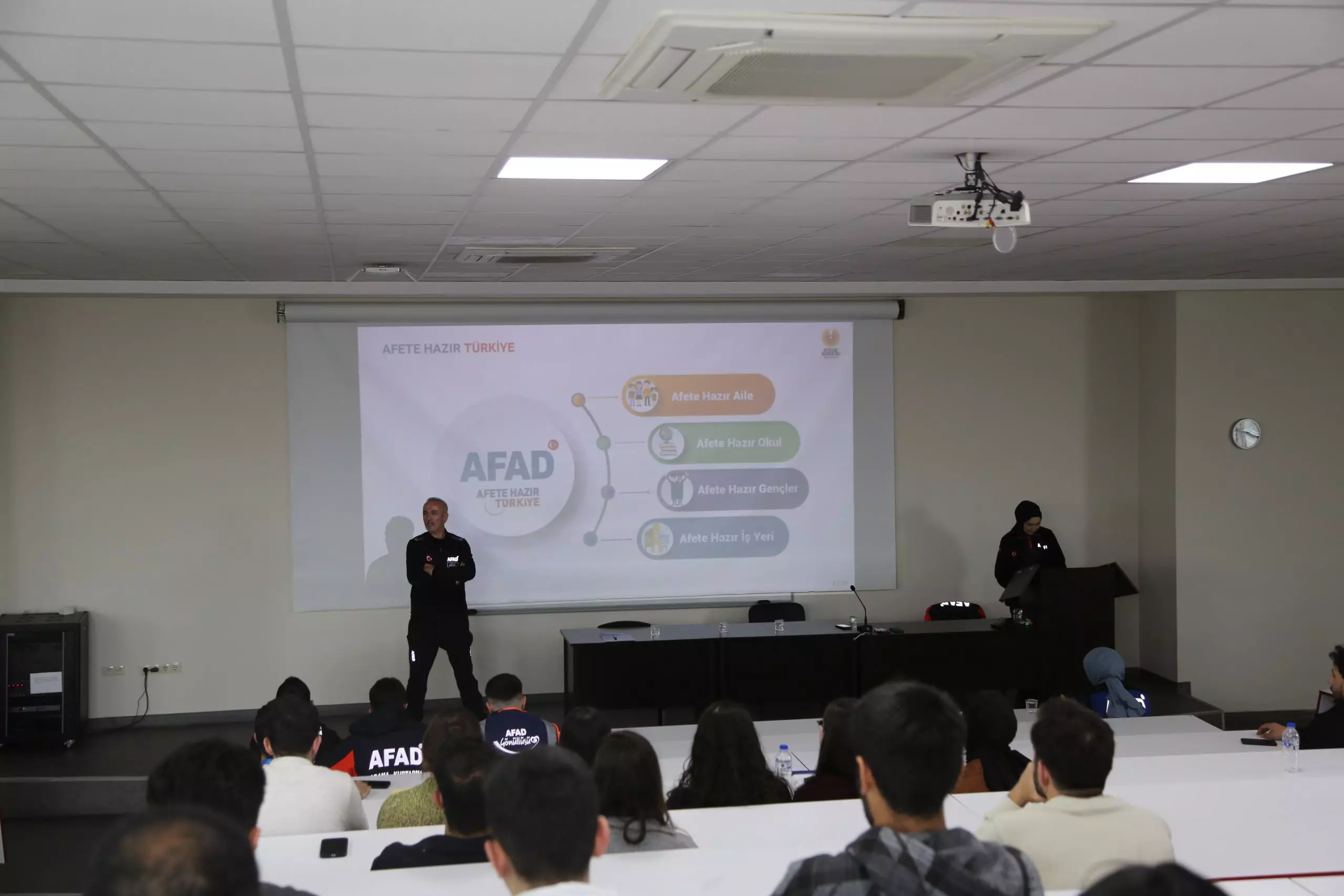 Amfi 3’de gerçekleştirilen etkinliğe, AFAD Arama Kurtarma Birlik Müdürü Hasan Say, AFAD personeli Arzu Aktaş ve öğrenciler katıldı.